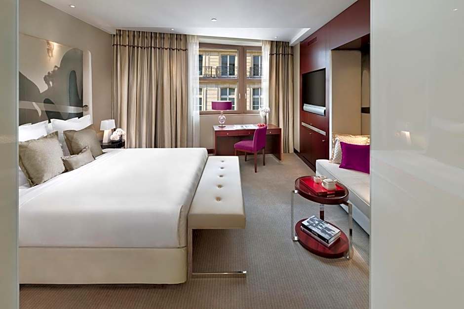 Boasting gold details, artworks and elegant furniture, this suite is made up of a bedroom with a king-size bed, a separate living room and a dressing room. The bathroom with mosaic-tiled flooring is complete with a large bathtub.